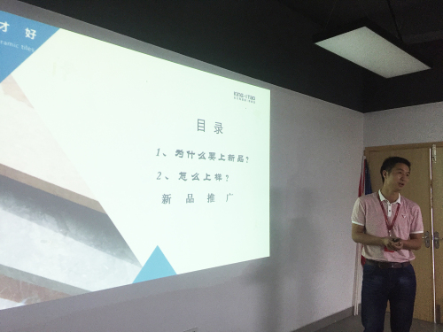 6月8日上午九點,金艾陶瓷磚華夏總部二樓會議室舉辦了一場別開生面的《新品推廣—完成下半年度業績的核武器》-銷售精英演講會,全體銷售精英以及市場部所有人員參與了本次會議。