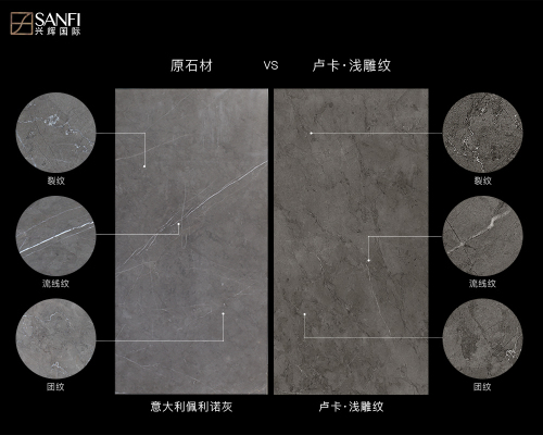 盧卡·淺雕紋系列與意大利佩利諾灰石材相比,盧卡·淺雕紋系列把原石材豐富紋理轉(zhuǎn)化為現(xiàn)實(shí)的細(xì)節(jié)美,把流線紋、團(tuán)紋、裂紋等多形態(tài)紋理精準(zhǔn)表現(xiàn),簡(jiǎn)約不失細(xì)節(jié)。技術(shù)的提升使得產(chǎn)品完全體現(xiàn)石材質(zhì)感,真實(shí)還原原石95%以上紋理細(xì)節(jié),讓產(chǎn)品整體效果裝飾趨向“完美、真實(shí)”,整體細(xì)節(jié)處理比原生石材自然還更耐看,更符合高端精致生活需求及美學(xué)審美。