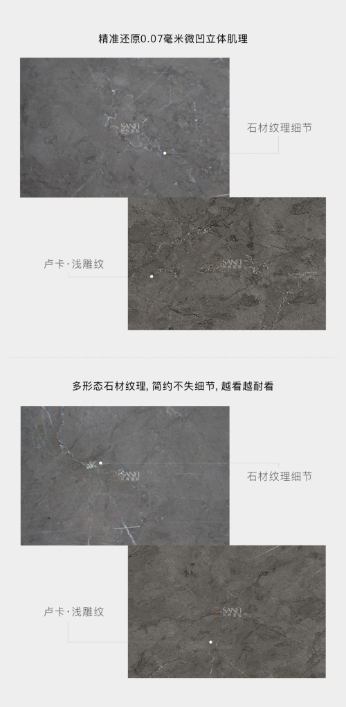 盧卡·淺雕紋系列,以先進(jìn)復(fù)合淺雕技術(shù)生產(chǎn),遠(yuǎn)比市面上其他產(chǎn)品更逼真還原天然石材肌理觸感,精細(xì)到0.07毫米微凹立體肌理,紋理細(xì)節(jié)不僅豐富且更加清晰耐看,越看越好看,源于石材又媲美石材,細(xì)節(jié)美出新高度。