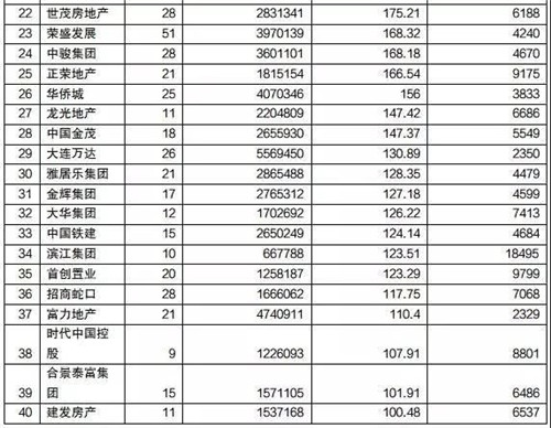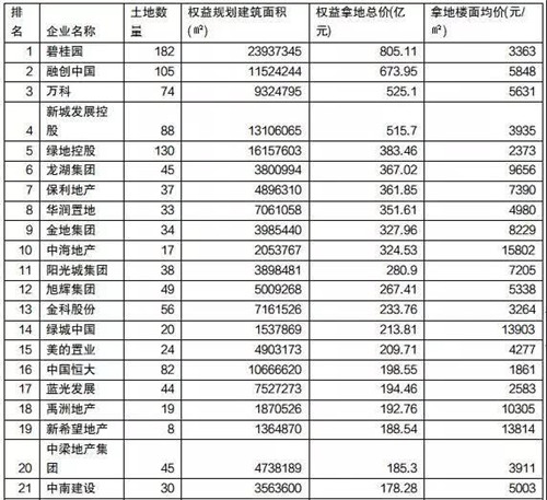 此外還有包括新城、中海、綠地、旭輝、金地、華潤、龍湖、陽光城、保利等多達15家房企拿地超過200億。