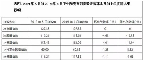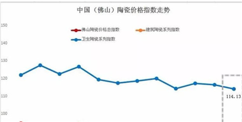 2019年6月13日,2019年5月份佛山陶瓷價格總指數公布。數據顯示,三大類指數全線下跌,市場行情逆勢下行。2019年5月份佛山陶瓷價格總指數報87.61點,環比跌幅1.50%,同比跌幅7.37%。建筑陶瓷系列指數報83.20點,環比跌幅1.39%,同比跌幅7.58%;衛生陶瓷系列指數報114.13點,環比跌幅1.96%,同比跌幅6.47%。5月三大類指數齊齊下跌,佛山陶瓷市場交易逆勢下行,多數代表品跌幅加大,市場行情整體下滑。
