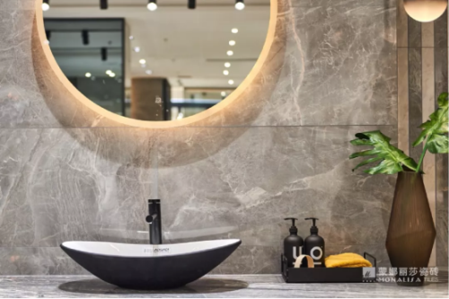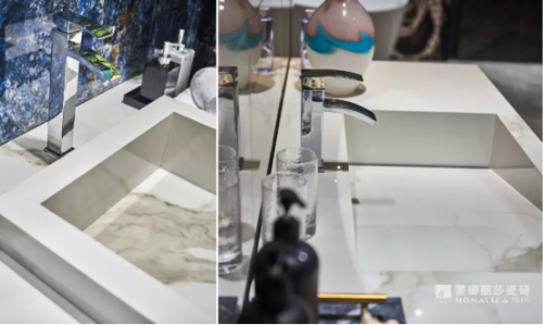 陶瓷大板的出現,讓仿石瓷磚不局限于墻面和地面,更運用到其他衛浴用具的設計,如洗手臺桌面、洗手池等,連續的石紋在奢華之余,制造出一種原生態的質感。