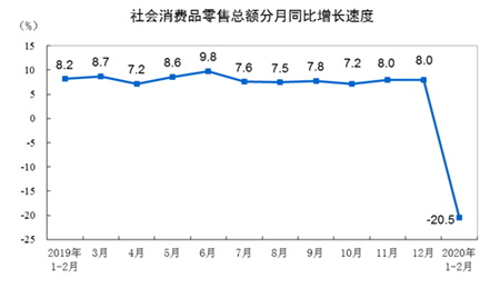 日前,據國家統計局統計,1-2月份,社會消費品零售總額52130億元,同比名義下降20.5%,增速比去年同期回落28.7個百分點。其中,家具類142億元,家具下降33.5%,建筑及裝潢材料類152億元,同比下降30.5%。這些建材品類銷售所在的線下實體門店等客流量呈現斷崖式下滑。
