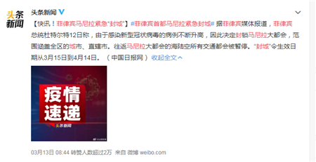 日前,菲律賓總統(tǒng)杜特爾特在全國電視講話中宣布,將菲律賓的預(yù)警等級(jí)升至最高級(jí)—紅色代碼2級(jí),同時(shí)宣布決定封鎖馬尼拉大都會(huì),范圍涵蓋全區(qū)的城市、直轄市。往返馬尼拉大都會(huì)的海陸空所有交通都會(huì)被暫停。“封城”令生效日期從3月15日到4月14日。