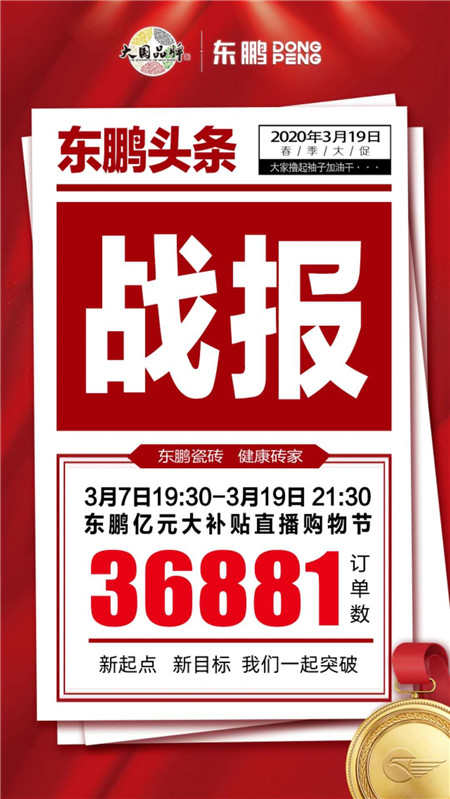 筆者記得,3月19日,歷時13天的東鵬瓷磚春季大促“億元大補貼,鉅惠不聚會”的超級直播購物中,東鵬瓷磚事業部國內經銷副總裁查永根親臨直播間帶貨。最后,東鵬瓷磚超級直播盛典以2小時突破3.6萬+訂單,在線觀看量突破150萬人次。瀏覽181萬人次,分享66萬人次。