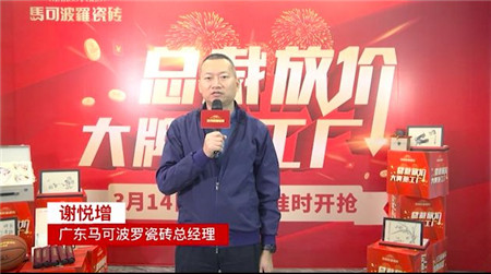3月14日,馬可波羅瓷磚“總裁放‘價’,大牌搶工廠”大型線上直播大促活動中,唯美集團常務副總裁、廣東馬可波羅陶瓷有限公司總經理謝悅增親臨直播間。最終,這場直播大促累計在線觀看人數超146w,獲得2.5w+訂單。