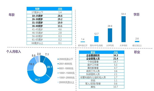 本次調查樣本集中在大學專科和大學本科,占比83.3%,個人月收入以6000-10000萬收入水平居多,占比38.7%,職業大多為企業上班族,共占比55.7%。