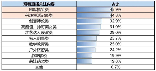 從消費者觀看直播時關注的內容來看,消費者最容易被“幽默搞笑類”和“興趣生活記錄類”內容所吸引,分別占比45.9%和44.8%。“創意特效類”和“高顏值、帥哥美女類”內容的關注度也都超過30%,可見消費者觀看直播時更容易被“有趣”又“有顏”的內容吸引。