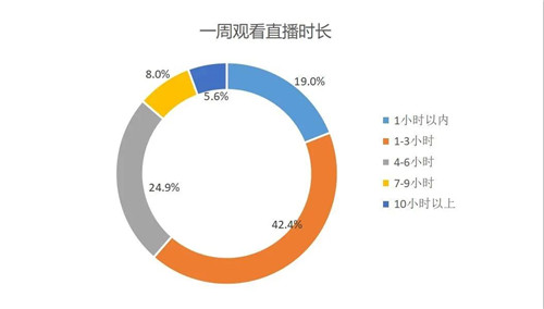 從一周觀看直播的時長調查結果來看,42.4%消費者觀看直播時長為1-3個小時,24.9%消費者觀看直播時長為4-6個小時。