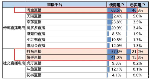 調查數據顯示,使用淘寶直播的消費者占比68.5%,經常使用淘寶直播的消費者占比46.3%,處于絕對領先優勢;其次為抖音直播和快手直播,使用用戶占比分別是57.8%和41.0%,經常使用的忠實用戶占比分別是21.2%和15.3%。