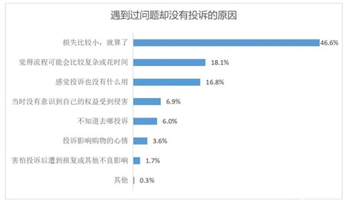 對遇到問題未投訴的消費者進一步調查后發現,46.6%的消費者認為“損失比較小,就算了”;比較突出的原因還有消費者覺得投訴處理流程可能會比較復雜或花時間,占比達18.1%;也有不少消費者認為投訴也沒有什么用。