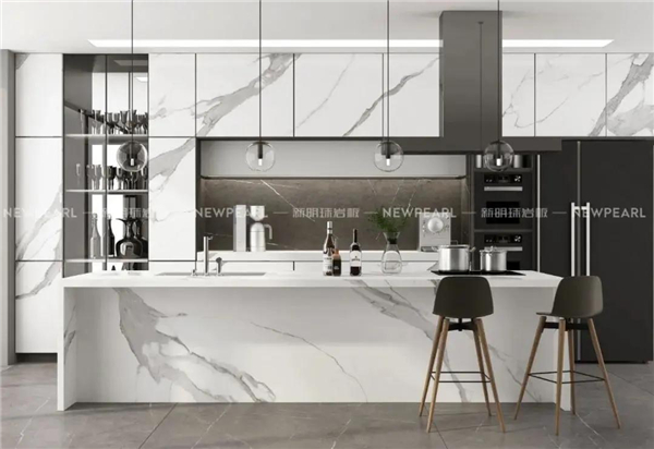 ▲新明珠巖板冰川印象系列柜面及廚房島臺應(yīng)用