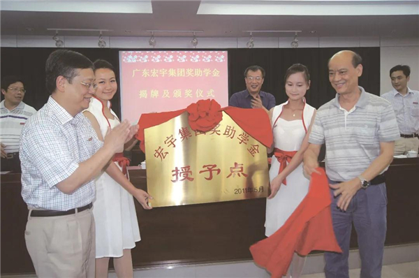 圖 |2011 年6 月10 日,景德鎮陶瓷大學材料學院“宏宇”獎助學金正式設立,并舉行了隆重的揭牌儀式。時任景德鎮陶瓷學院院長周健兒(左)與時任宏宇集團副總經理歐家瑞(右)共同為“宏宇”獎助學金揭牌