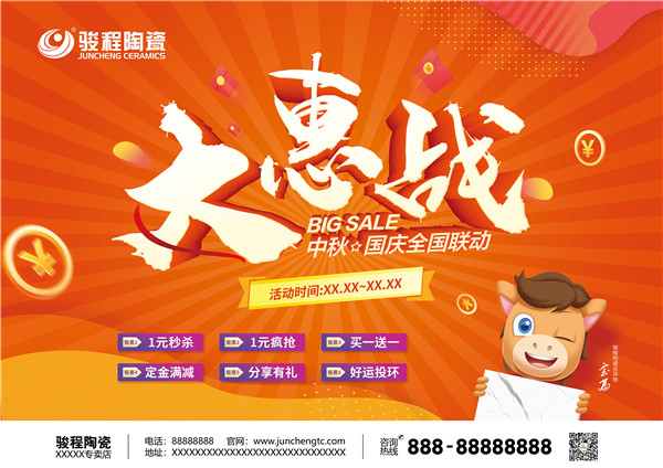 雙節同慶,正是置家的好時機。全國各地黃金周促銷大勢所趨,駿程陶瓷“程”勢而為,廠商一心,以中秋國慶全國聯動“大惠戰”為主題打響黃金周大促,再度展現品牌強大實力!