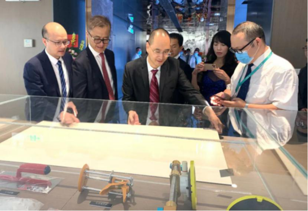 海鷗住工集團董事長唐臺英先生、海鷗冠軍有限公司董事、總裁龍根先生,海鷗冠軍有限公司董事、副總裁兼品牌總經理李丹鋒先生為冠軍磁磚華南營銷中心揭幕。