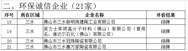 據了解,佛山市生態環境局對納入2019年度佛山市生態環境局企業環境信用評價管理的342家企業的環境保護信用情況進行審核,評為綠牌(環保誠信企業)的僅有21家,占參與評級企業的6.6%,而新明珠獨占三席。