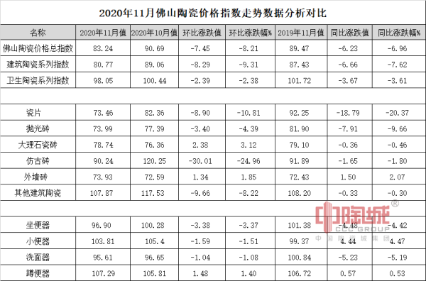 2020年11月份佛山陶瓷價格總指數報83.24點(10月報90.69點),環比跌幅8.21%,同比跌幅6.96%。建筑陶瓷系列指數報80.77點(10月報89.06點),環比跌幅9.31%,同比跌幅7.62%;衛生陶瓷系列指數報98.05點(10月報100. 44點),環比跌幅2. 39%,同比跌幅3.61%。11月份,進入年末,佛山陶瓷及衛浴產品受市場需求減弱影響,多數代表品價格下跌,產品庫存高企,總指數深幅下挫,各分類指數跌幅加大。