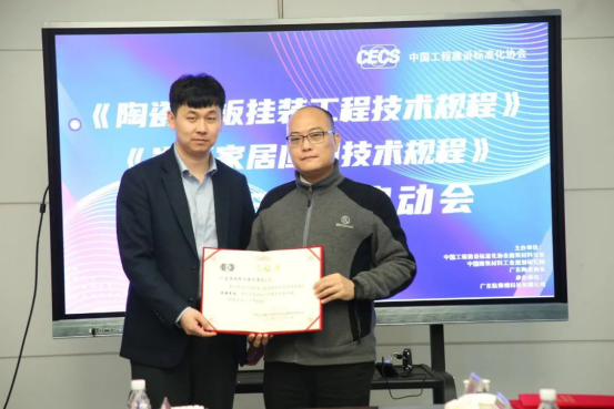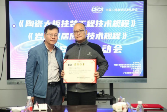 會議最后,為表彰參編單位對行業標準化工作做出的積極貢獻,廣東陶瓷協會秘書長王衛國和中國工程建設標準化協會建筑材料分會秘書長王立羣為企業代表頒發了榮譽證書。