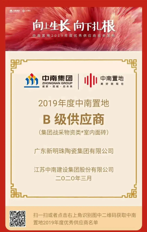■ 冠珠瓷磚榮獲“2019年度中南置地B級供應商”