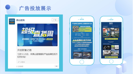 10月12-22日期間,利用朋友圈廣告投放作為本次活動引流渠道之一,更好的引起潛在用戶對超級直播周的線上招商的關注,同時提高了品牌的認知度。行業推累計曝光量達25W+。