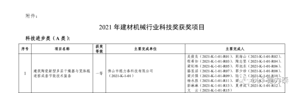近日,通過申報、評審、公示、公布等環節,德力泰研發的“建筑陶瓷新型多層干燥器與寬體輥道窯成套節能技術裝備”項目,榮獲2021年建材機械行業科技進步一等獎。