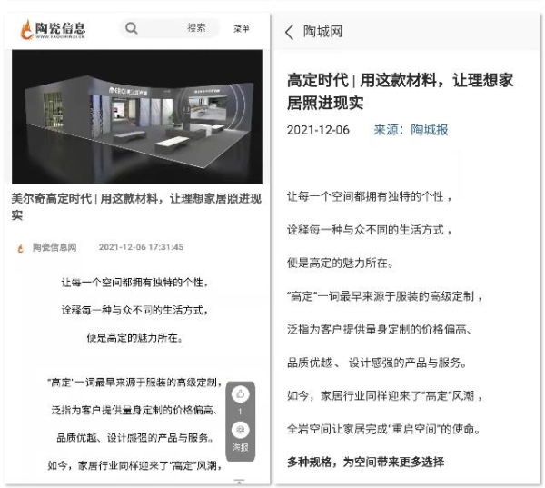 本屆高定展,美爾奇圍繞顏值、個(gè)性、功能、美學(xué)等關(guān)鍵詞,向人們展示了正在到來(lái)的全巖家居時(shí)代,這也引起了眾多媒體的關(guān)注報(bào)道。中國(guó)建材網(wǎng)、陶城網(wǎng)、陶瓷信息、華夏陶瓷網(wǎng)、鳳凰網(wǎng)、美家網(wǎng)、搜狐焦點(diǎn)家居等數(shù)十家權(quán)威媒體均對(duì)美爾奇參展盛況進(jìn)行了重點(diǎn)報(bào)道,美爾奇“向美而生,重構(gòu)高定空間”成為行業(yè)熱議的話題。