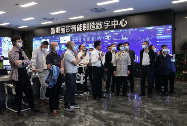 走在蒙娜麗莎特高板示范車間,藍綠相間的地面讓研討班成員們一行感受到蒙娜麗莎干凈明亮的車間作業(yè)環(huán)境,看著智能制造數(shù)字中心三塊超大屏幕上一目了然的各條生產(chǎn)線、每個工序生產(chǎn)狀況、生產(chǎn)過程數(shù)據(jù)。研討班成員們紛紛為蒙娜麗莎在陶瓷制造智能化、綠色化所做的積極探索和成果點贊。