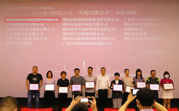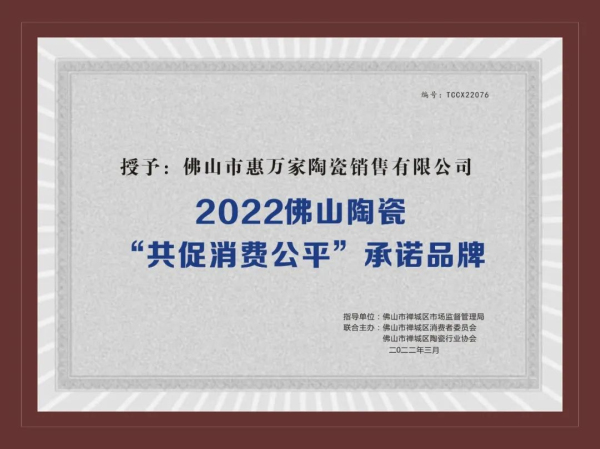 惠萬家瓷磚作為行業龍頭新明珠旗下的實力品牌,憑借過硬的產品質量和市場口碑,獲得了2022佛山陶瓷“共促消費公平”承諾品牌和2021佛山陶瓷安全生產達標企業兩項殊榮。