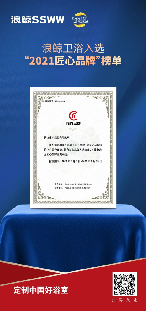 浪鯨衛(wèi)浴曾在智見(jiàn)·2021中國(guó)家居新時(shí)代盛典暨金致獎(jiǎng)?lì)C獎(jiǎng)典禮中,榮膺“2021消費(fèi)者信賴(lài)十大衛(wèi)浴品牌”,并于今年3月,榮獲“匠心品牌”榮譽(yù)稱(chēng)號(hào),實(shí)力印證強(qiáng)勢(shì)的品牌影響力,是消費(fèi)者值得信賴(lài)的品牌。