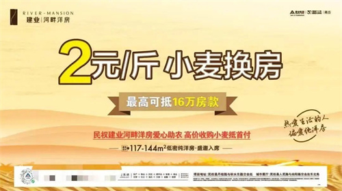 據悉,買房小麥大蒜能抵首付是建業的兩個活動,第一個是建業·河畔洋房近期推出“小麥換房”的購房活動。海報顯示,開發商收購小麥抵首付款,按照2元/斤的價格收購,最高可抵16萬元。銷售人員稱,“在當地可以不用把小麥拉到售樓部,賣給糧食收購點有憑證,拿憑證來就可以補貼了。”還表示,自6月20日活動以來,通過這一活動已經賣出了兩套。