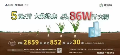 而則“大蒜換房5元/斤抵首付”的收購力度更大一些。有銷售人員告訴媒體,“目前大蒜的市場價在1.5/元一斤,我們優惠力度還是比較大的。”據介紹,大蒜可抵房款的20%,即50萬元總房款可抵10萬元。廣告一出,項目16天(5月22日至6月6日)成交了86萬斤大蒜,來電2859組,到訪852組,成交30套。從樓盤官微宣傳來看,樓盤現在為現房。