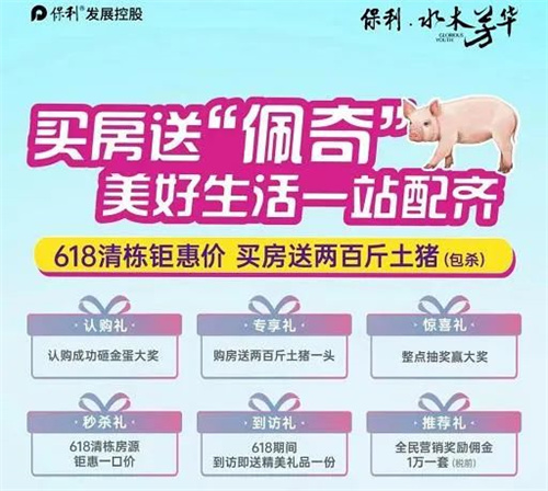 江蘇連云港海州區的水木芳華項目,則在6月18日-19日推出買房送一頭200斤土豬,甚至還備注“包殺”。相關人員了解到,以目前壹號土豬(五花肉)的市場價為27元/斤為例,200斤土豬的價值也就是5400元。
