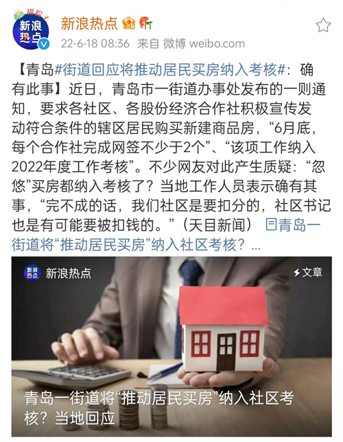6月,青島薛家島街道辦事處發布了關于做好促進居民購買新建商品房的通知,其具體內容如下:為貫徹落實上級部署,各社區、各股份經濟合作社積極宣傳發動符合條件的轄區居民購買新建商品房,并做好購房意愿摸排情況,組織開展新建商品房團購工作。此外還提到:“6月底,每個合作社完成網簽不少于2個”、“該項工作納入2022年度工作考核”。