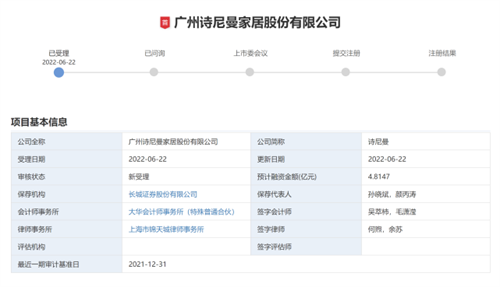6月22日,廣州詩尼曼家居股份有限公司(簡稱“詩尼曼”)IPO申請獲受理。其本次公開發行股票數量不超過2420萬股,公司本次公開發行股票數量占公司發行后總股本的比例不低于25%,公司和主承銷商可采用超額配售選擇權,采用超額配售選擇權發行股票數量不得超過本次發行股票數量的15%。