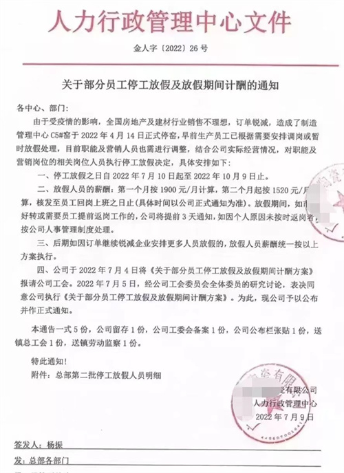 據媒體消息:7月9日,佛山一陶瓷企業發布《關于部分員工停工放假及放假期間計酬的通知》。通知顯示,受疫情影響,地產及建材行業銷售不理想,訂單銳減,造成該企業5#窯4月14日即正式停窯。該通知說,結合經營實際,對職能及營銷相關崗位執行停工放假決定調整。放假期間自7月10日起至10月9日止,放假人員薪酬首月按1900元/月計算,次月起起按1520元/月計算,核發至員工回崗上班之日止。