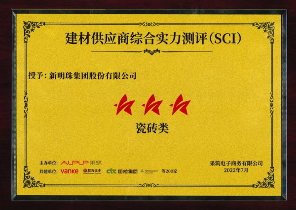 冠珠瓷磚始終堅持高水準的產品力和服務力輸出,贏得行業認可,在本次SCI綜合測評中獲評“三星供應商”,該獎項獲獎率僅為8.2%!