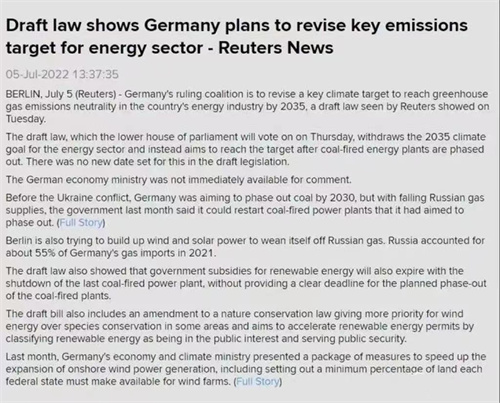 值得一提的是,俄烏沖突的爆發會對全球“碳中和”進程帶來諸多結構性變化。7月11日,“德國取消2035年碳中和目標”相關中文內容在網絡傳播,令國內環保能源界有些發懵。