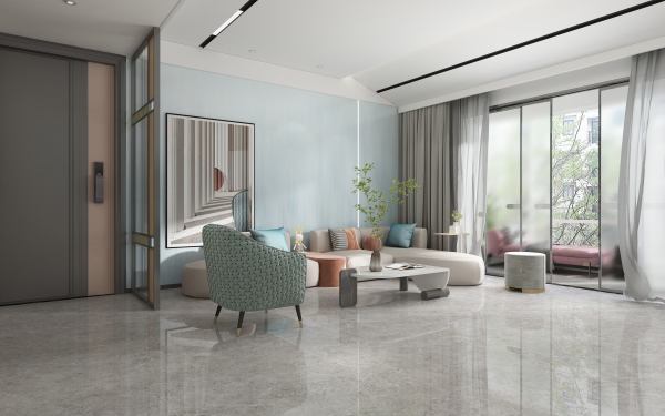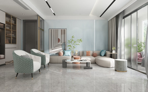 客廳選擇清新自然的春夏色彩。以素雅的淡藍色巖板作為背景墻,營造空間亮點所在,搭配簡單的灰色大理石瓷磚,碰撞出別樣的家居風情。適當加入橙色、綠色等莫蘭迪元素,讓整體配色更顯雅致高級,營造寬敞明亮、舒適大方的客廳空間。